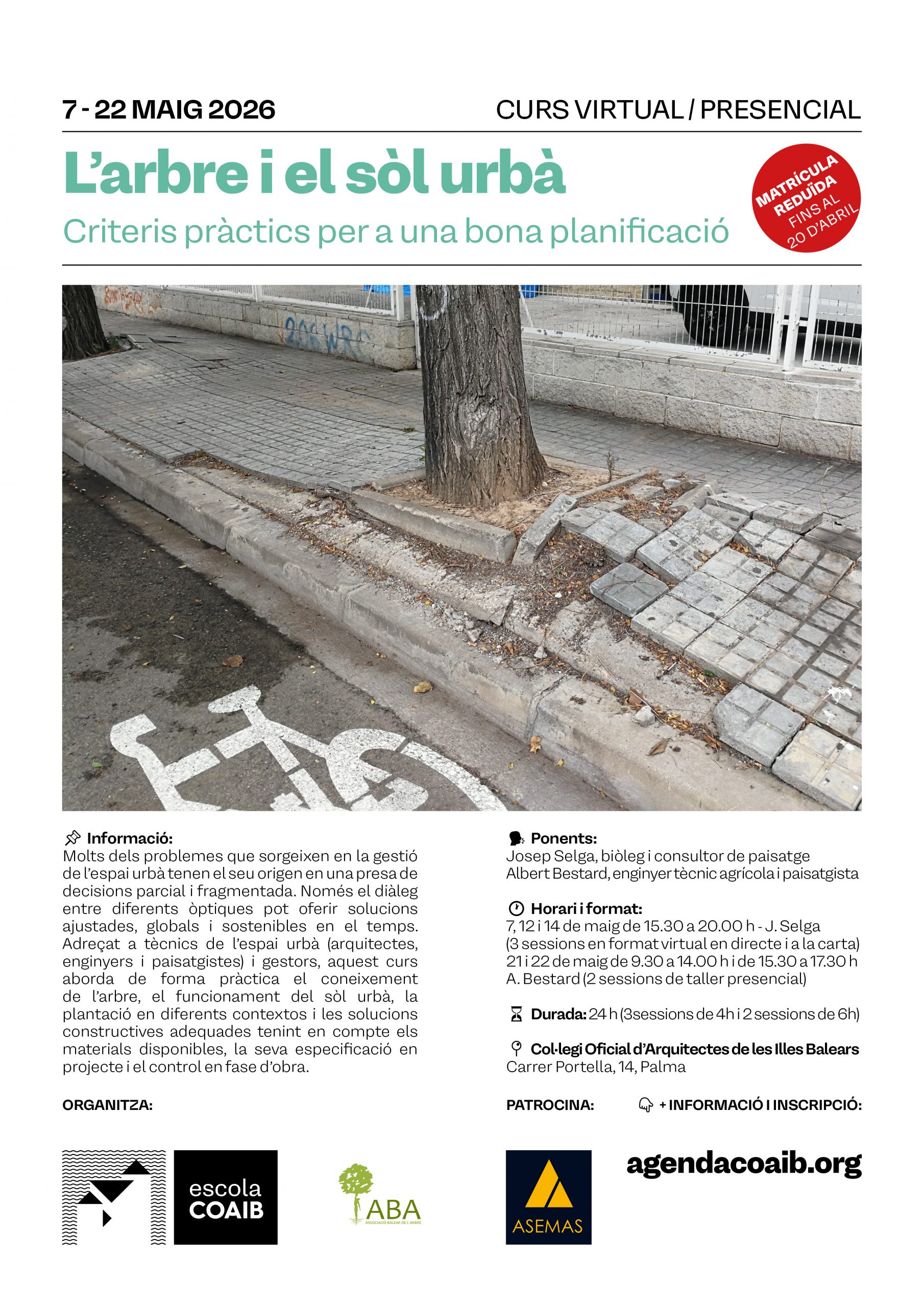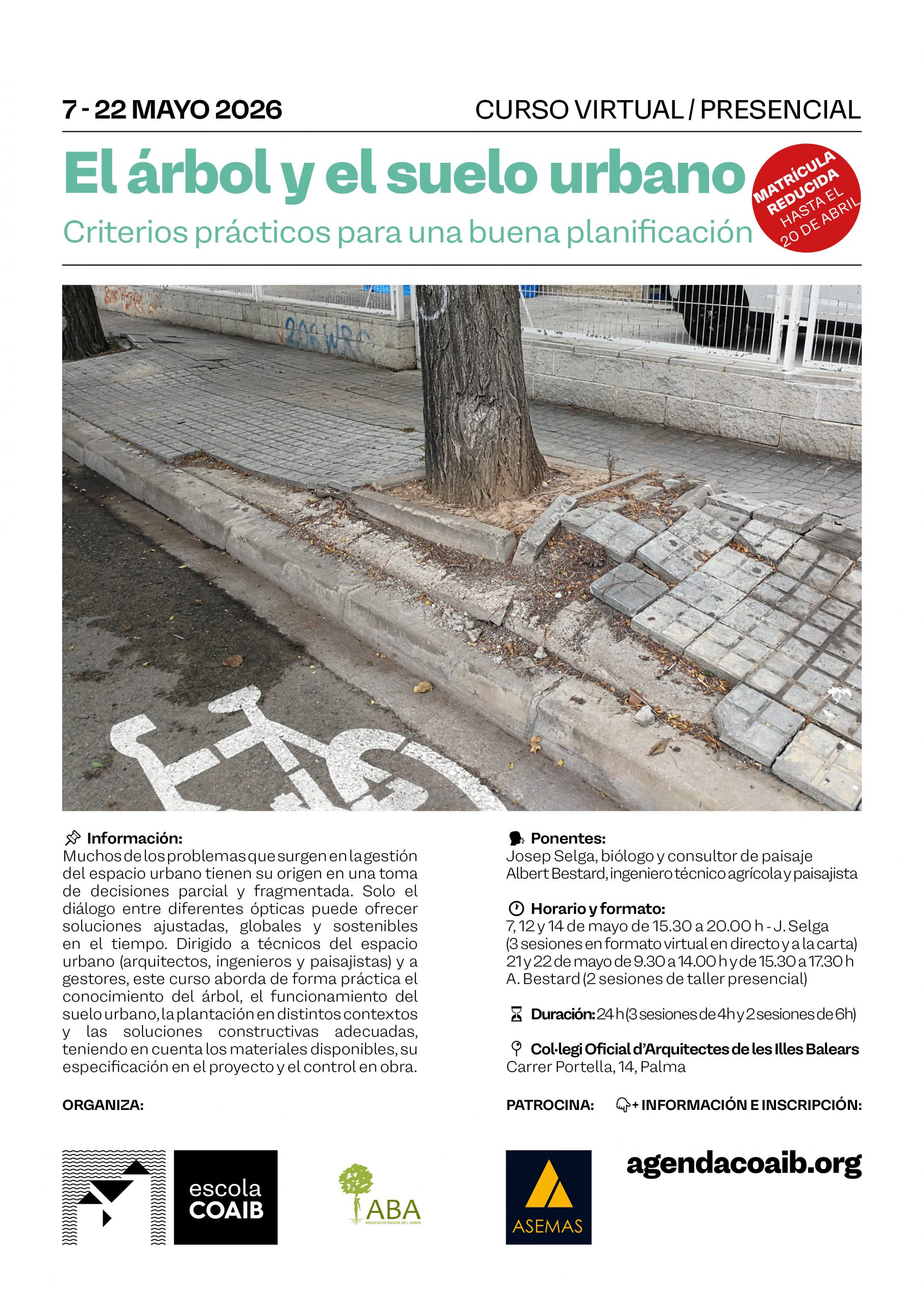 Ens plau anunciar-vos la celebració del curs “L’arbre i el sòl urbà: Criteris pràctics per a una bona planificació”, organitzat conjuntament per l’Escola COAIB i l’ABA (Associació Balear de l’Arbre), amb el patrocini d’Asemas.
